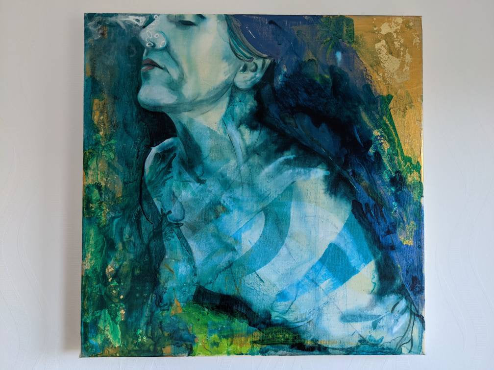 This unique and magical painting is 50cm x 50cm on deep edge gallery wrapped linen canvas. The texture of the linen is seen through the painting surface and gives the piece added texture. There are many, many layers of paint and ink and varnish, the texture is so luscious, with crackle effects and gold paint and gold leaf sitting in the layers pearly inks catch the light and the surface can almost look like water. The cropped pose of the figure gives the image an oppressive feeling, this is indicative of the part of the story, the little mermaid is essentially giving up her freedom.