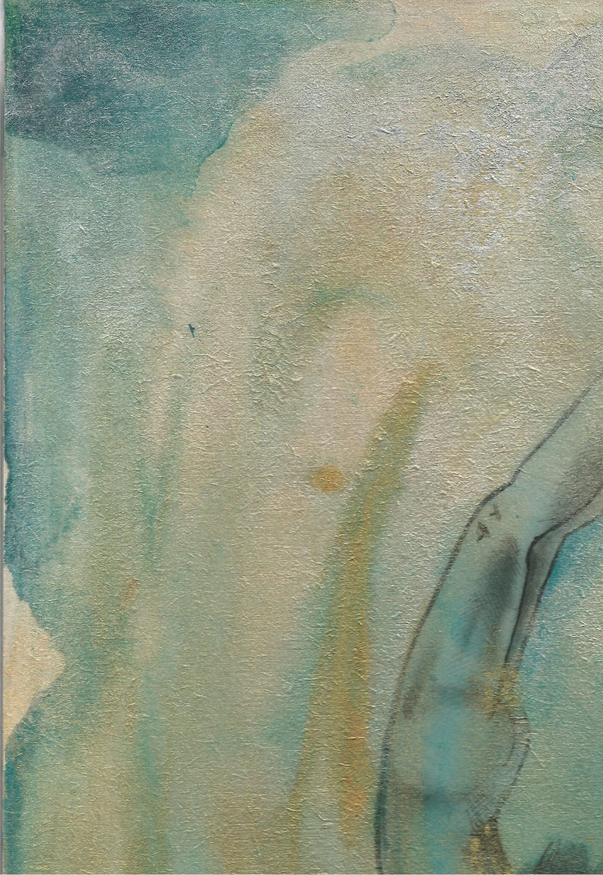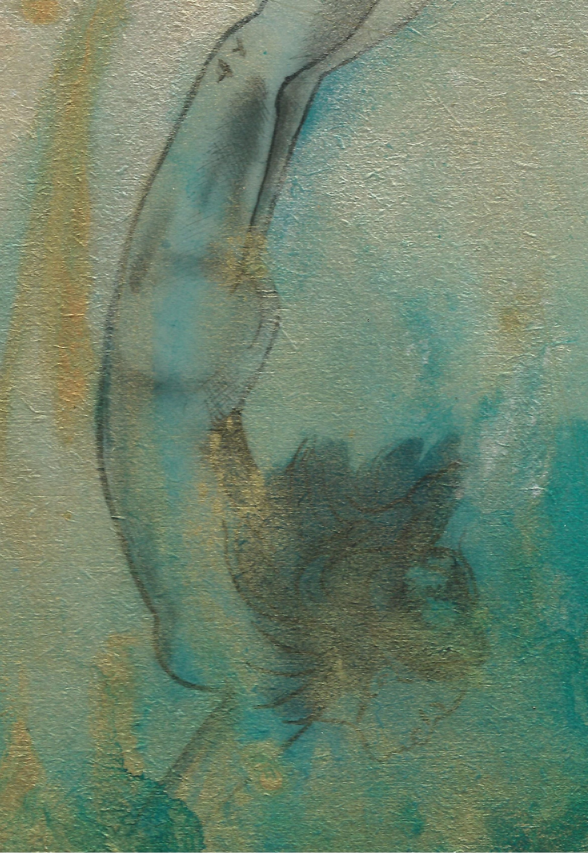 This painting is 21x29.5cm painted on wood panel, the surface is smooth, I have worked here are many, many layers of paint and ink and varnish, the texture is tactile, with crackle effects and smooth finishes, you want to run your hands and your eyes over it! In the layers pearly inks and gold acrylic catch the light and the surface can almost look like water.