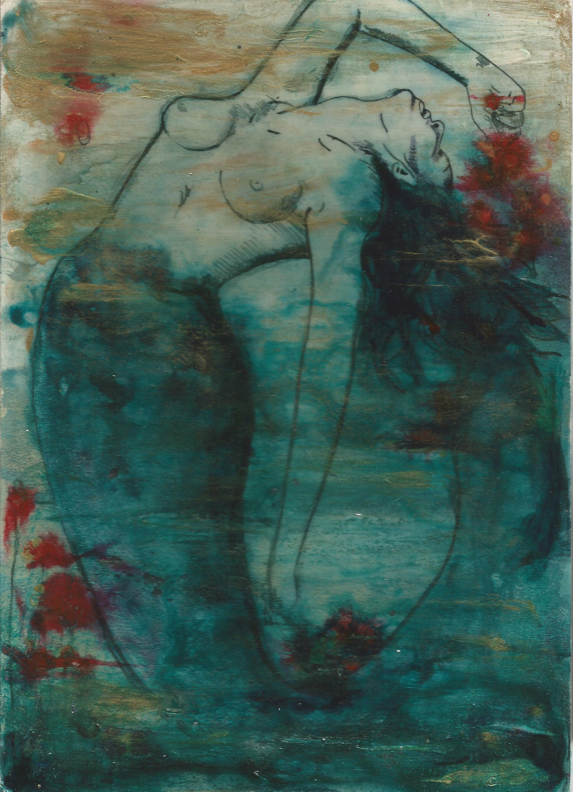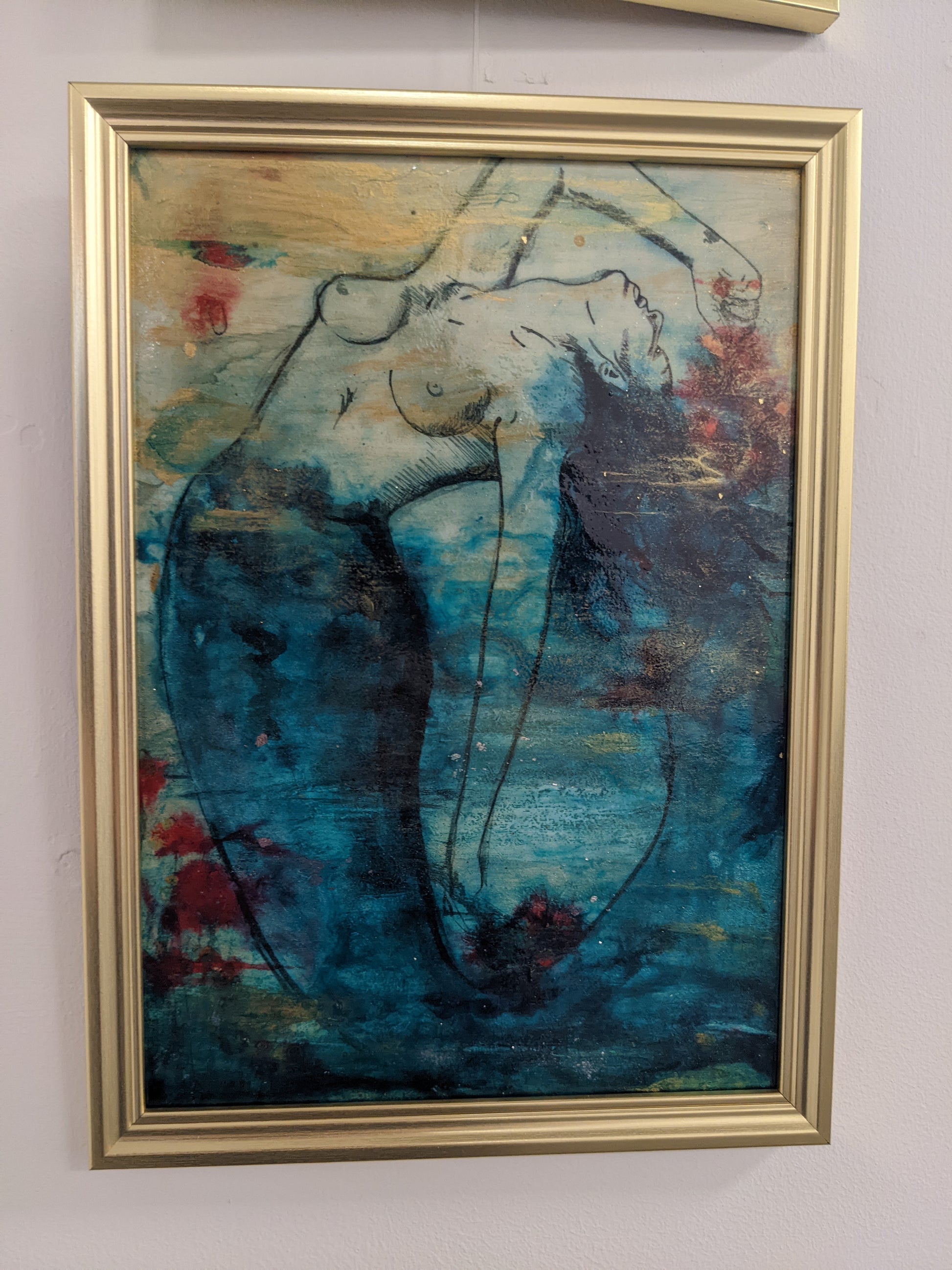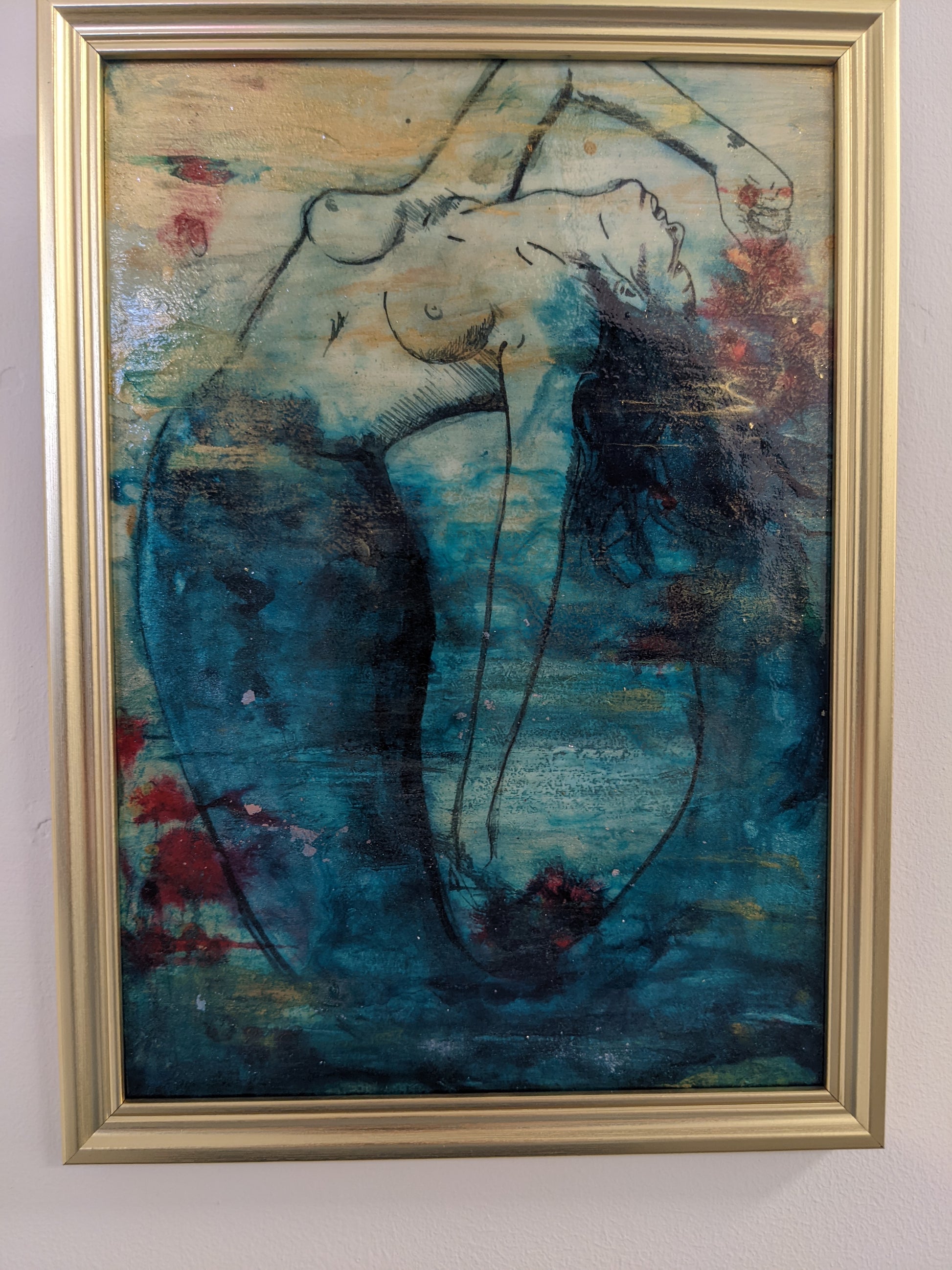 The image and gesture is poignant and expressive, the contrasts of gold, teal and red really makes this piece stand out.