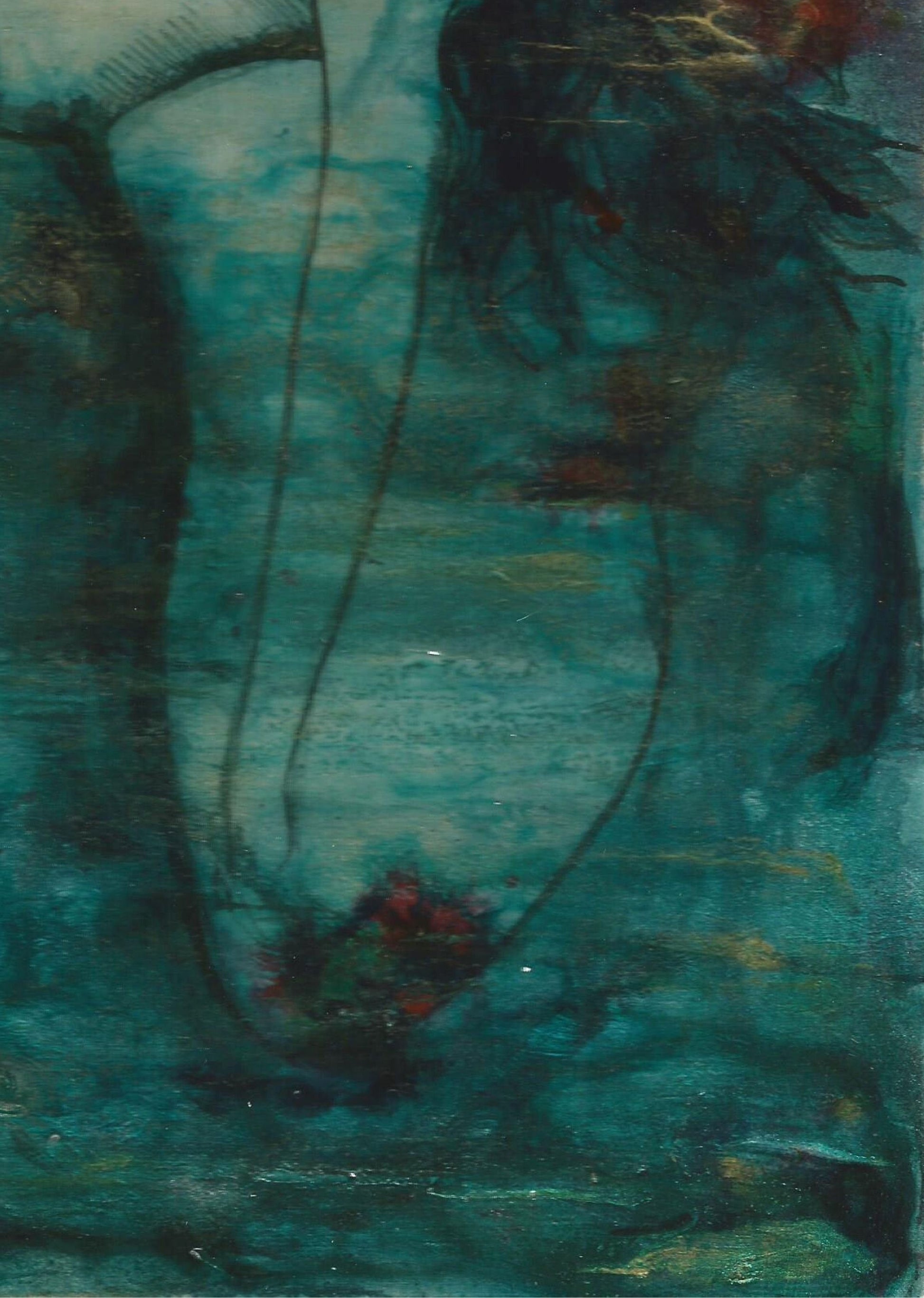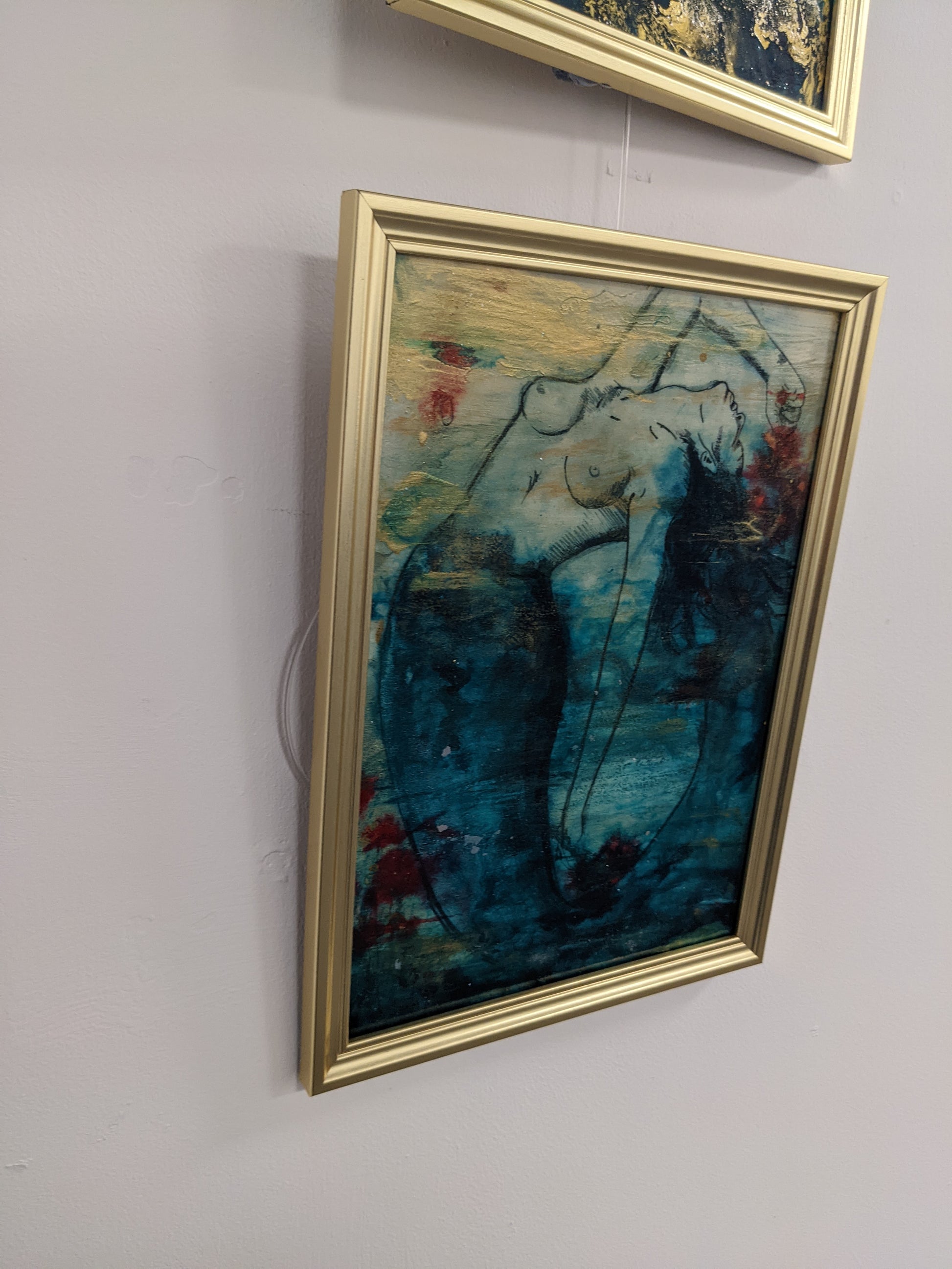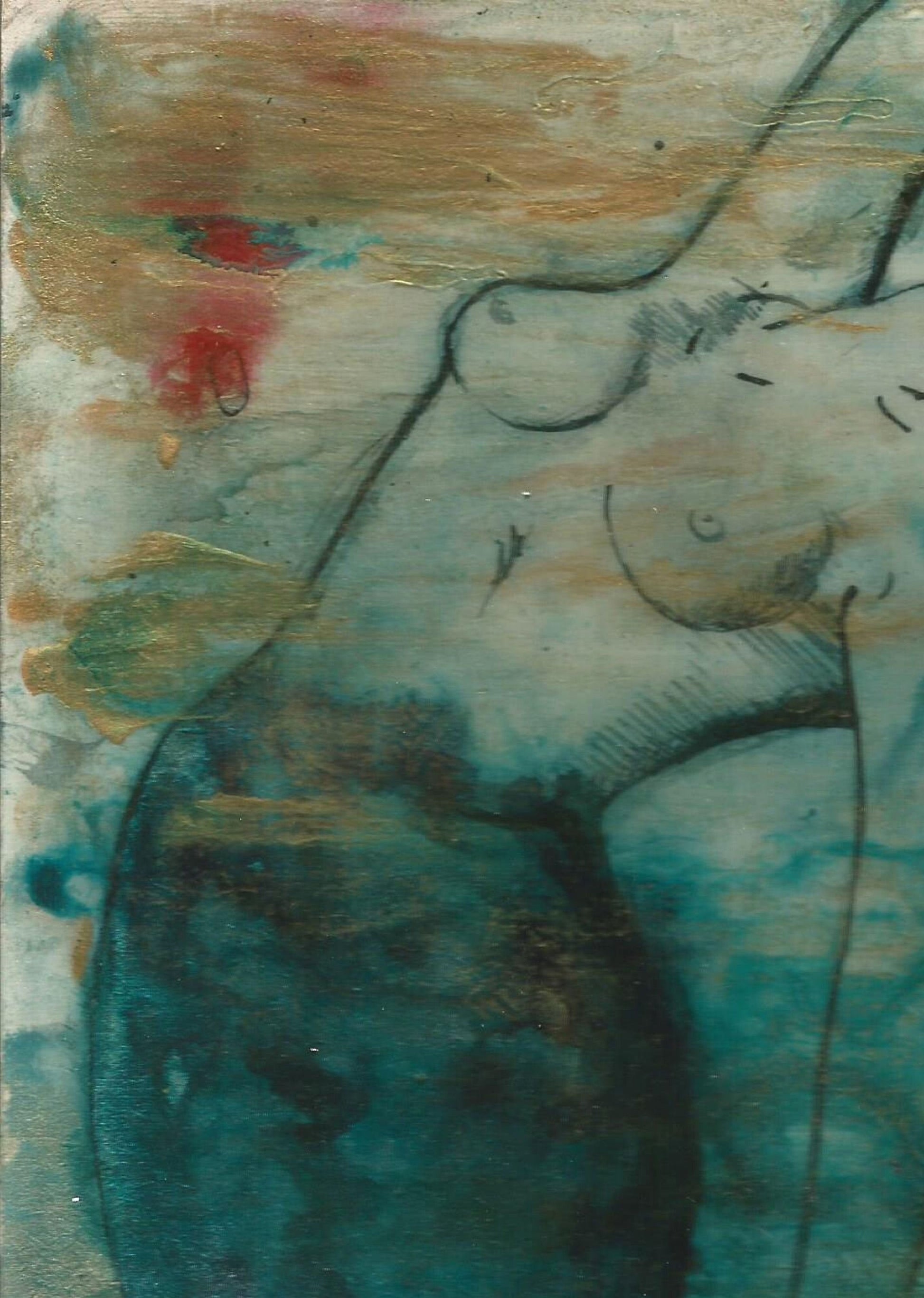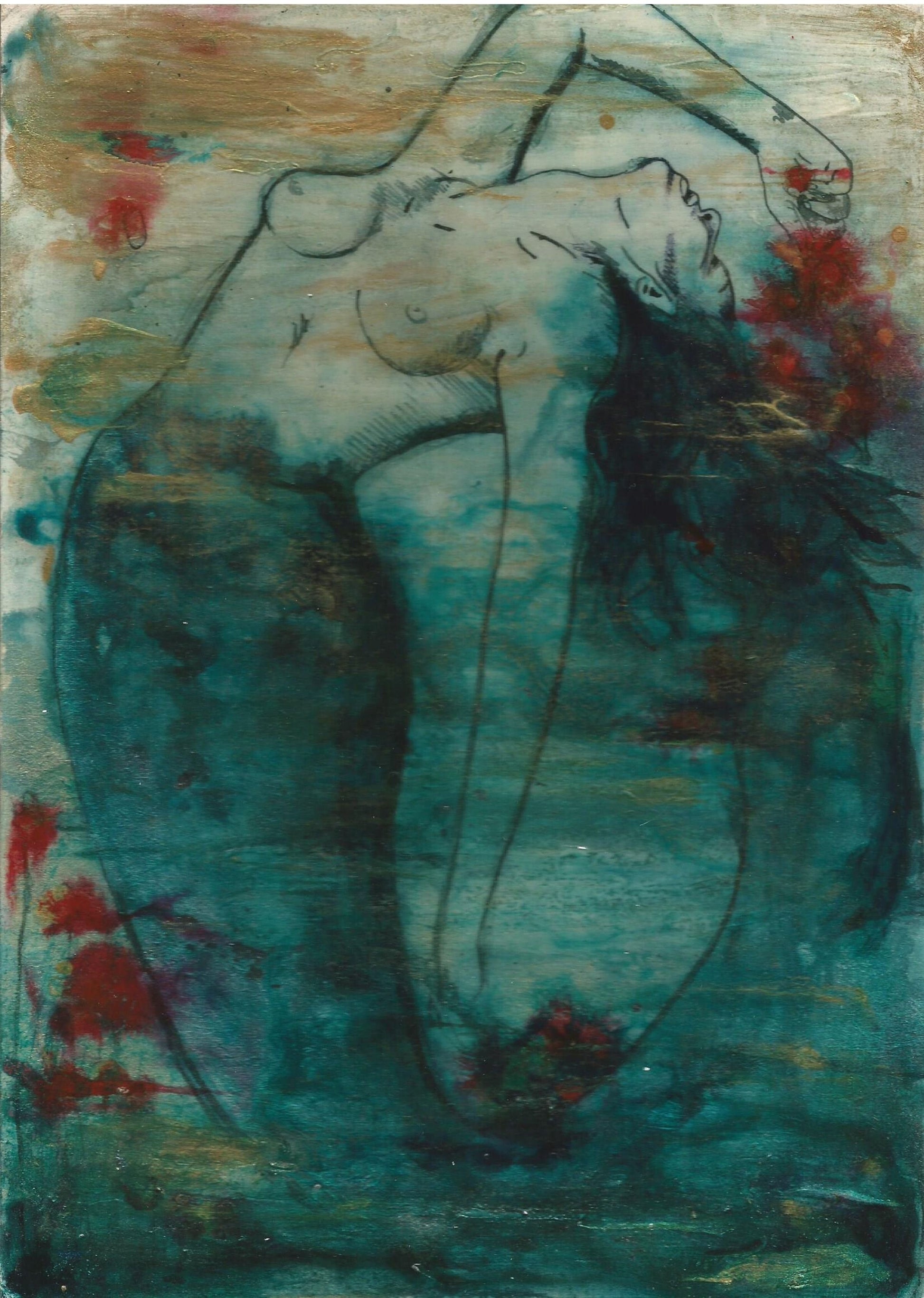 The image and gesture is poignant and expressive, the contrasts of gold, teal and red really makes this piece stand out.