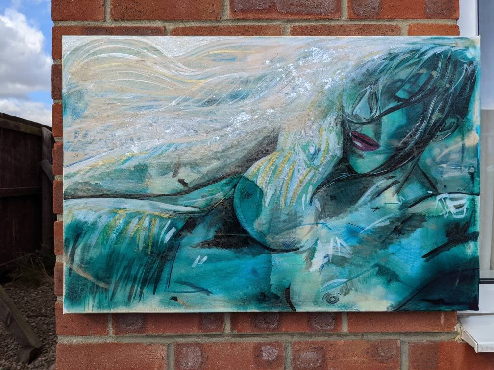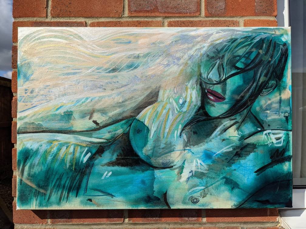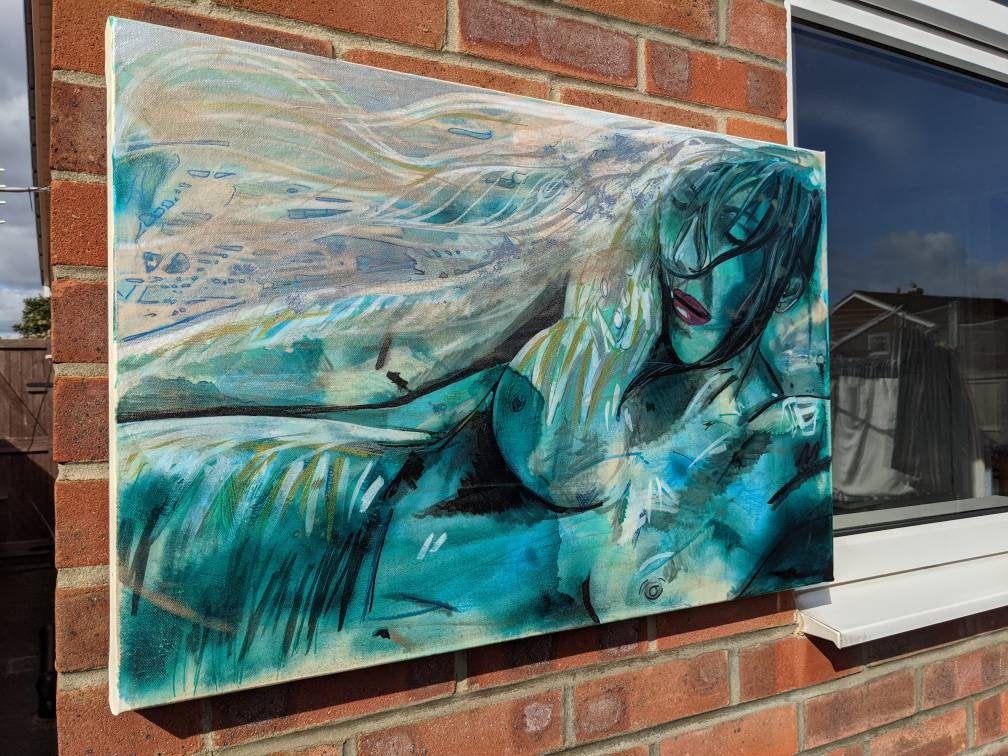 This stunning painting is 76cm x 50cm on deep edge gallery wrapped canvas. There are many, many layers of paint and ink and varnish, the texture is so luscious, with crackle effects and golds sitting in the layers pearly inks catch the light and the surface can almost look like water. The surface here becomes just as important as the image. Here I have played with imagery and abstract forms in the piece, imagine being swept away with the sea.