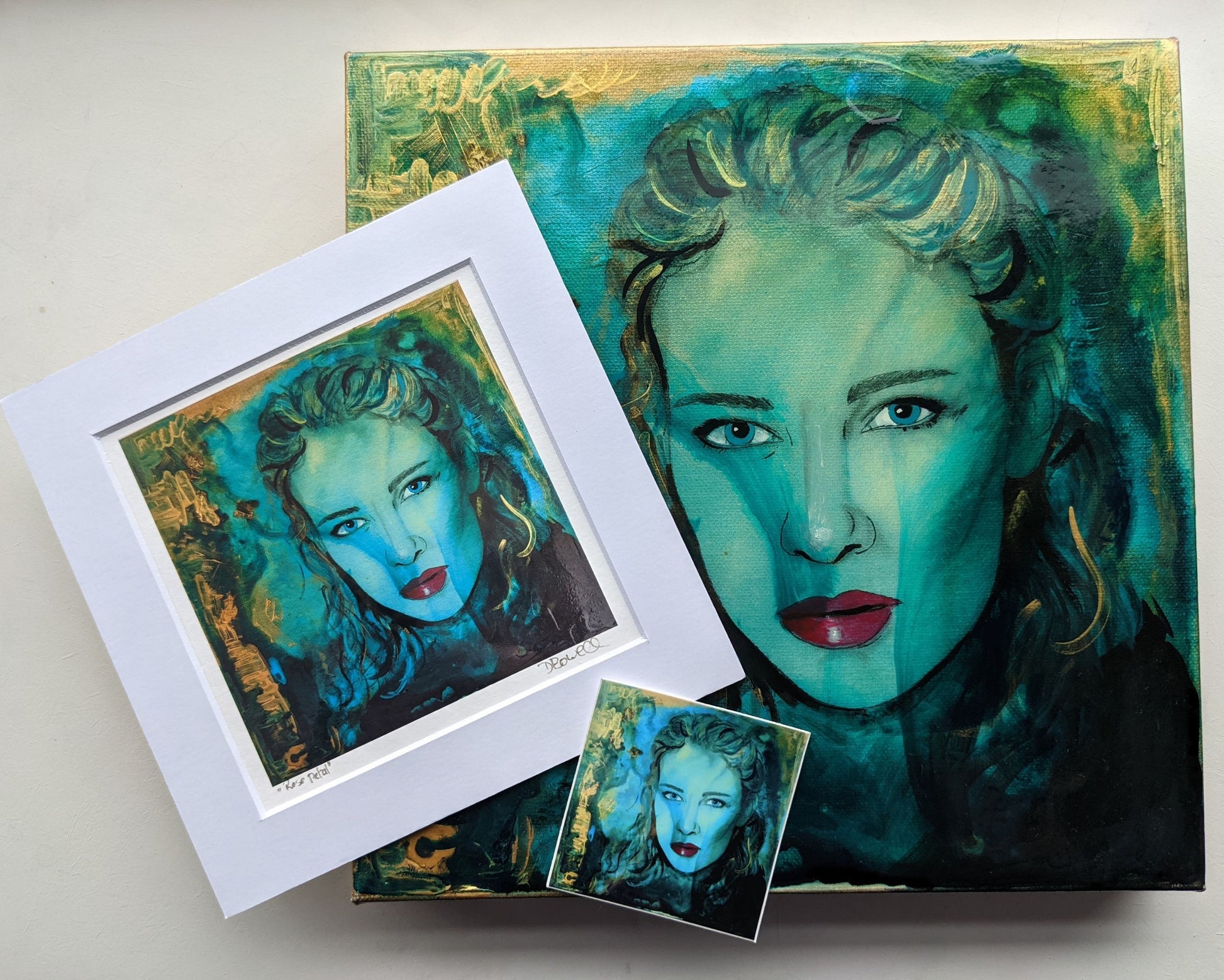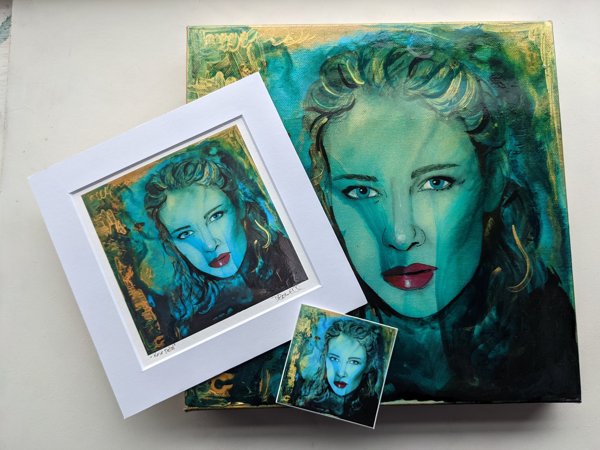 This gorgeous painting is 30cm x 30cm on deep edge gallery wrap canvas. The edges are gold which just sets the whole painting alive. There are many, many layers of paint and ink and varnish, I’m afraid the photographs don’t do the surface justice, but you can see a little more in the video, pearly inks catch the light and the surface can almost look like water as you change the angle you are looking at. The colours a vivid, its one of my favourites from this collection.