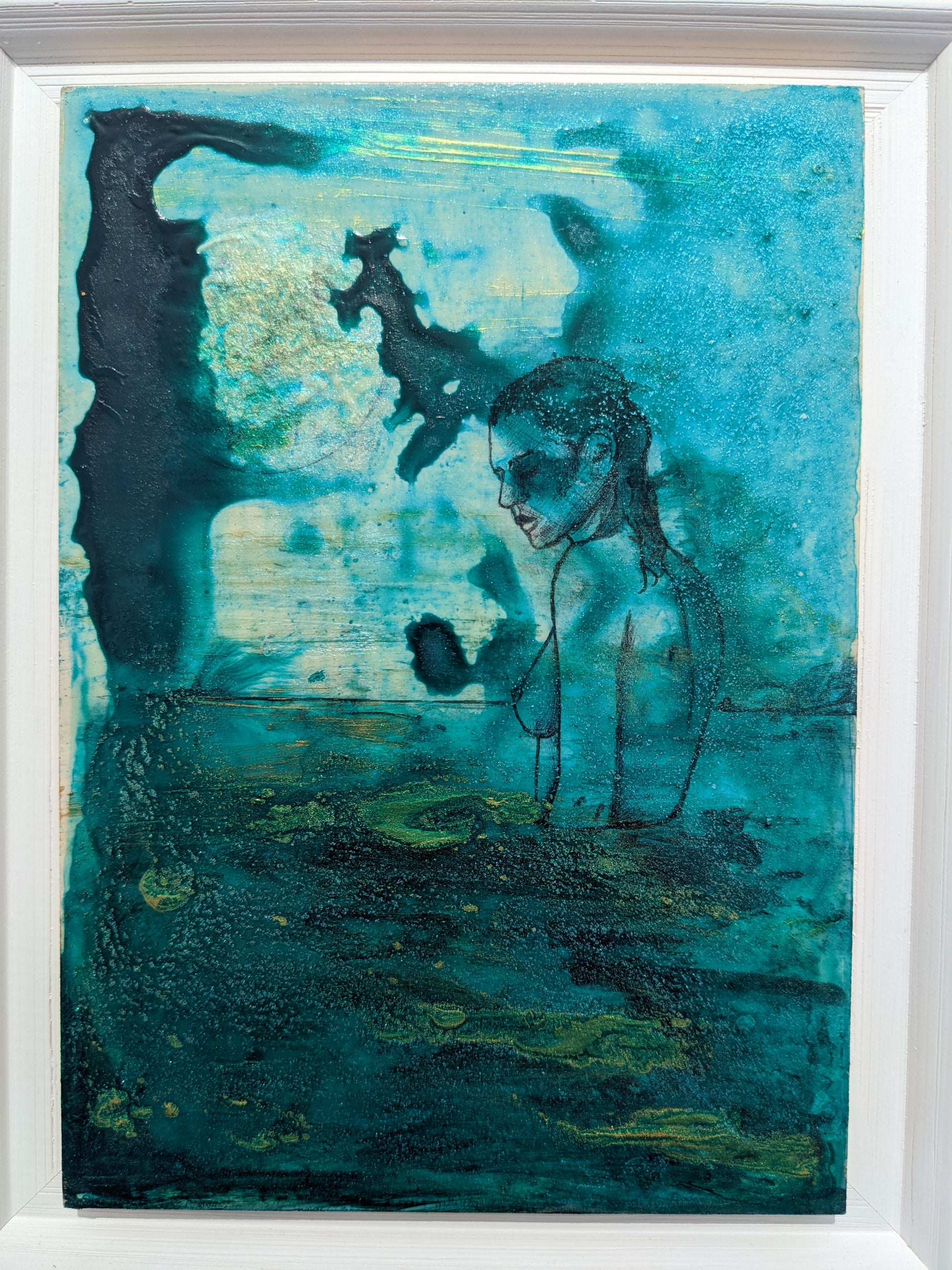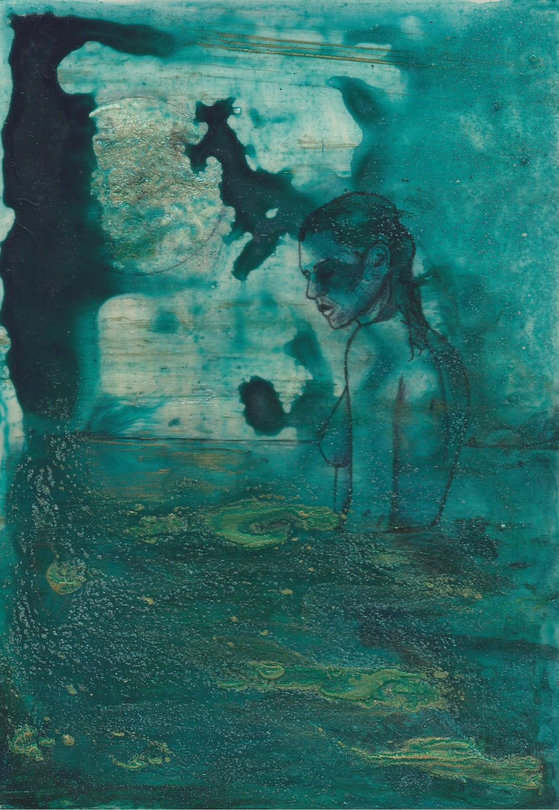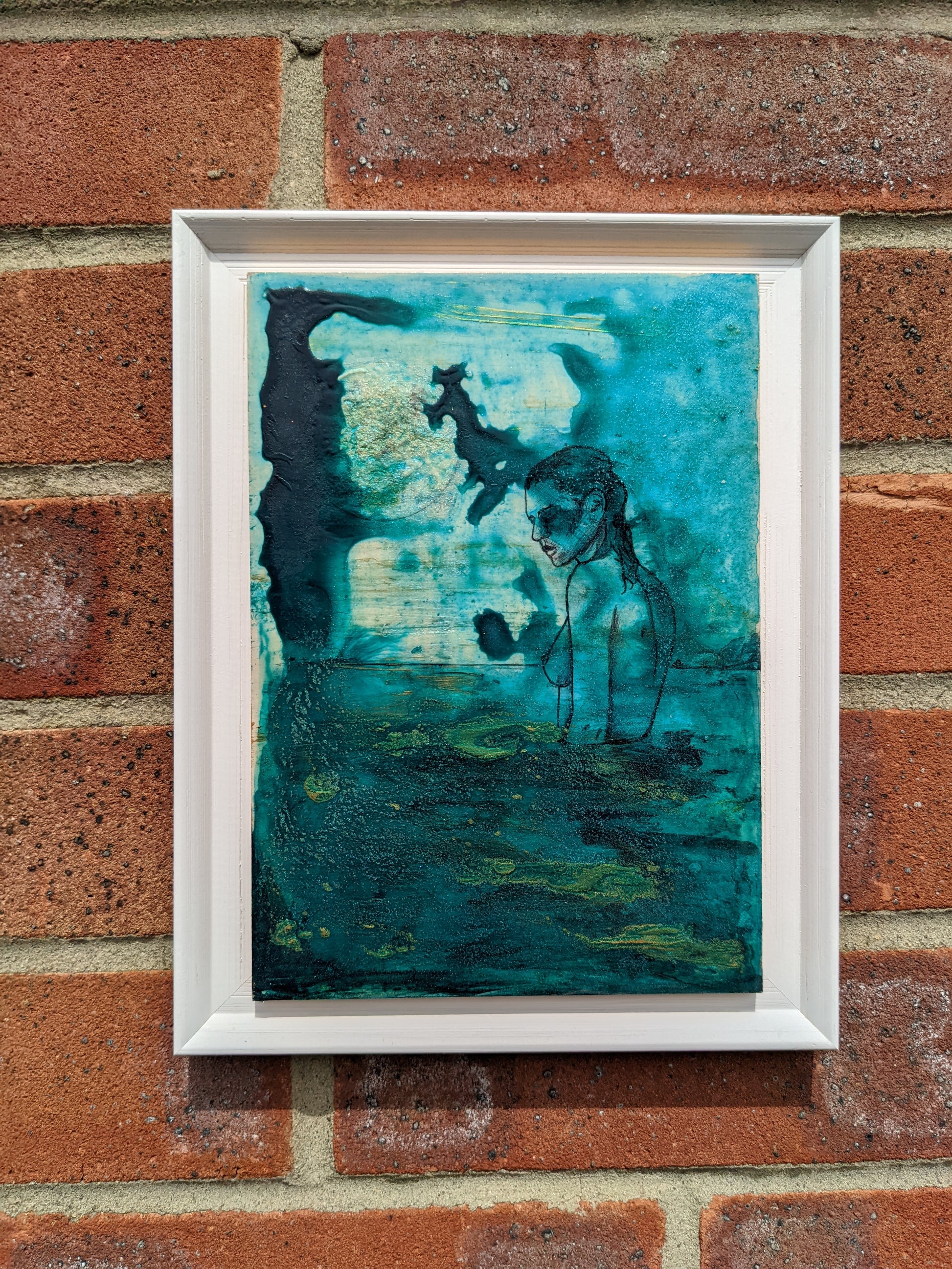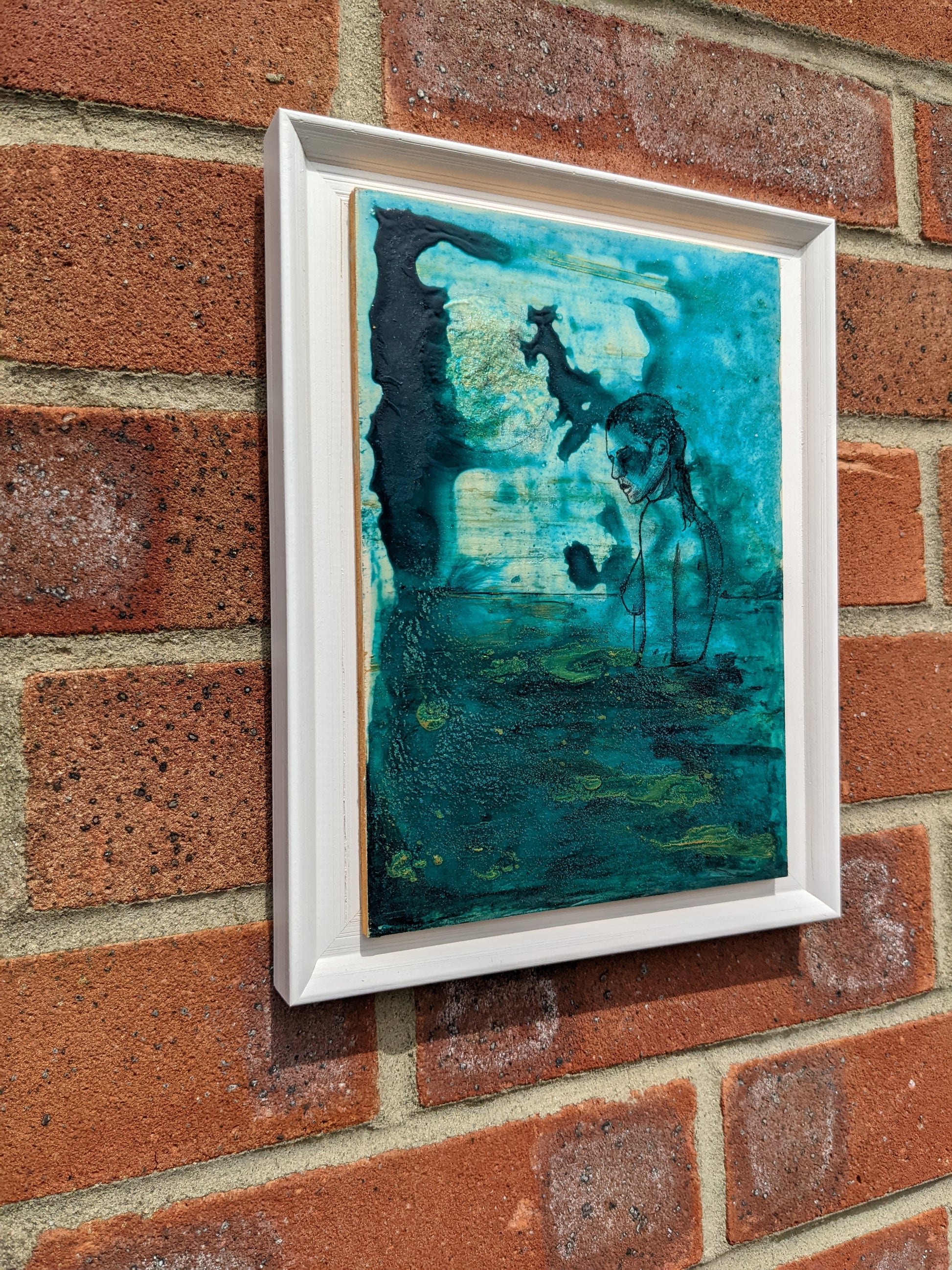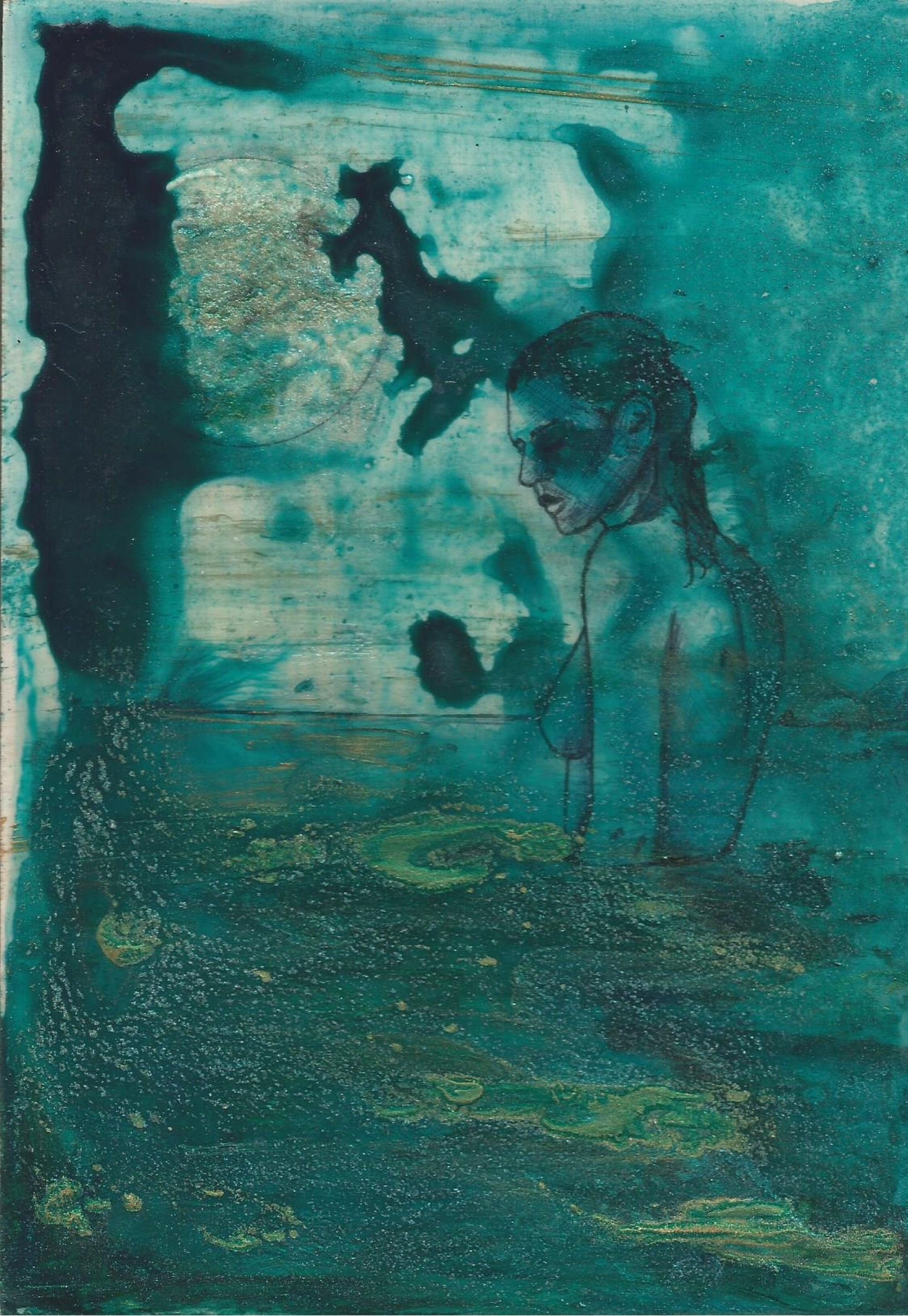 This painting is 14.5cm x 21cm painted on wood panel, the surface is smooth, I have worked here are many, many layers of paint and ink and varnish it also includes old leaf, the texture is tactile, with crackle effects and smooth finishes, you want to run your hands and your eyes over it! Watch the pearly inks glisten, reminding you of moonlight, this is a wistful and thought provoking painting.