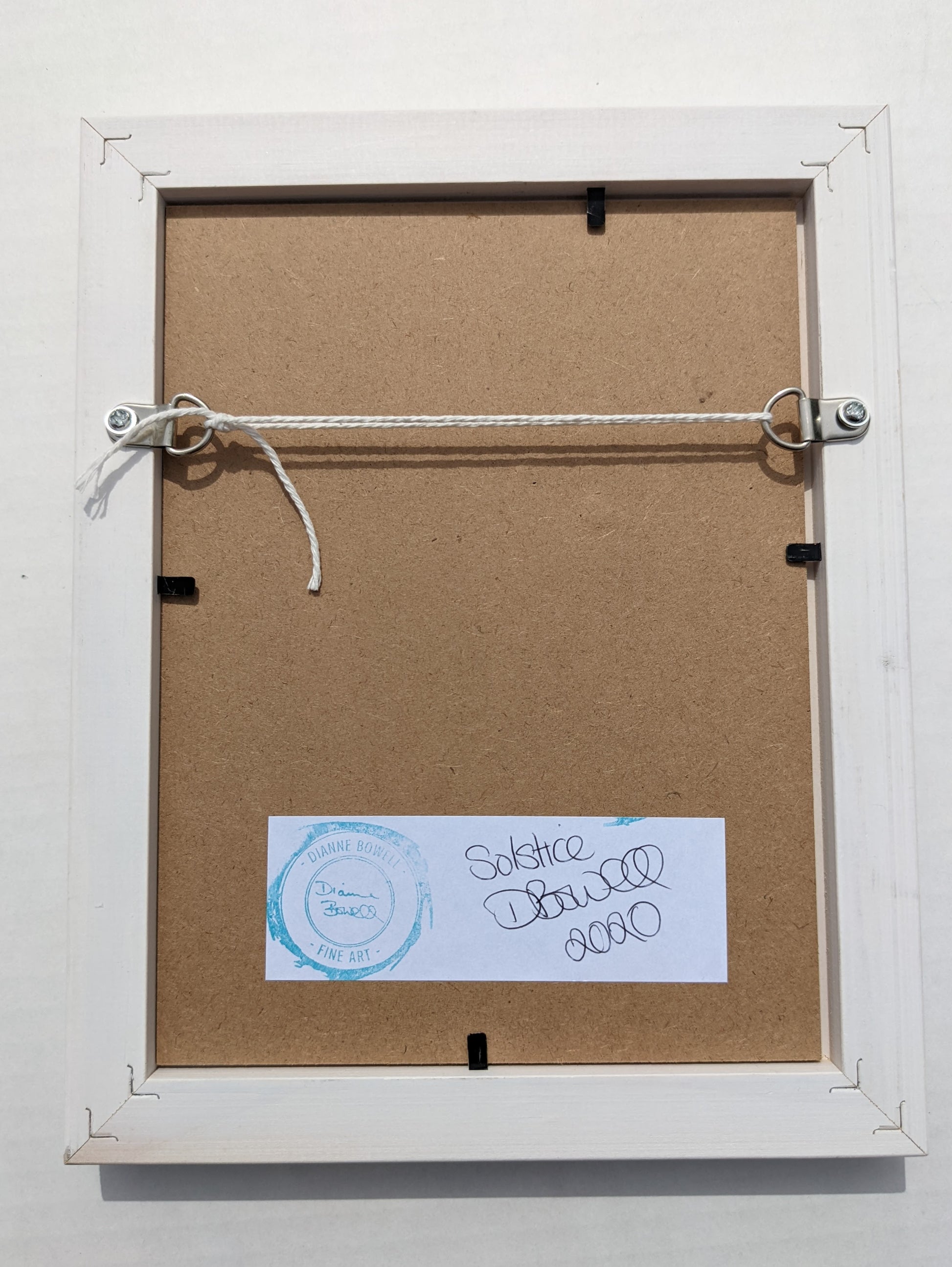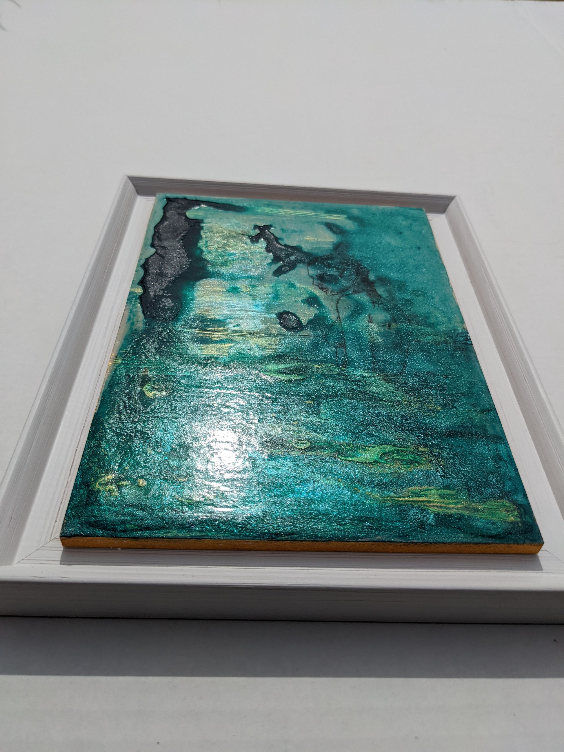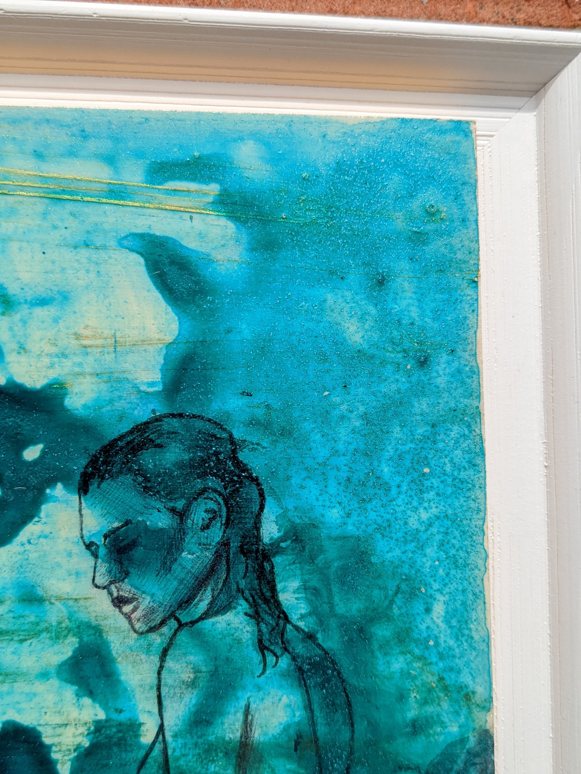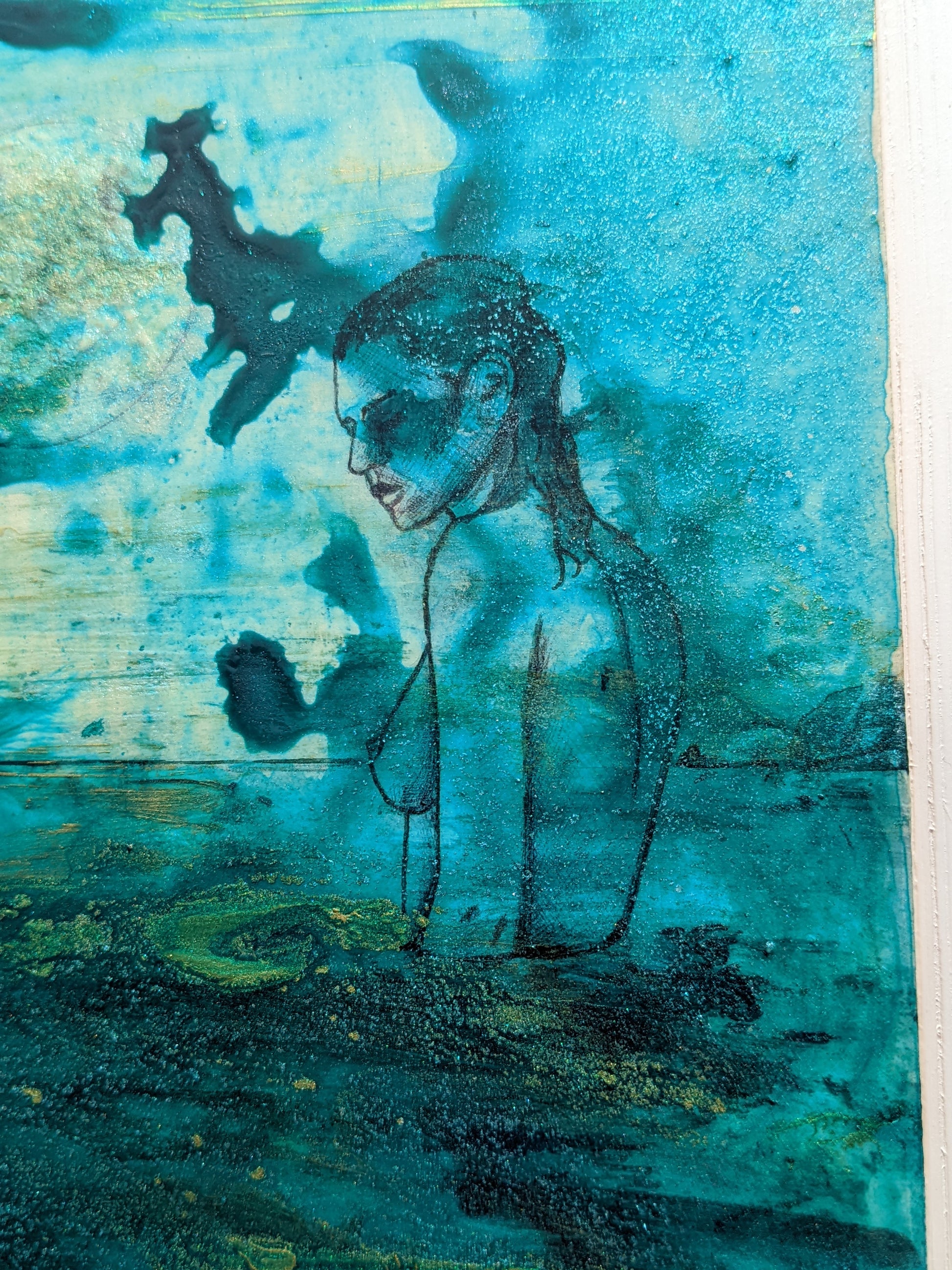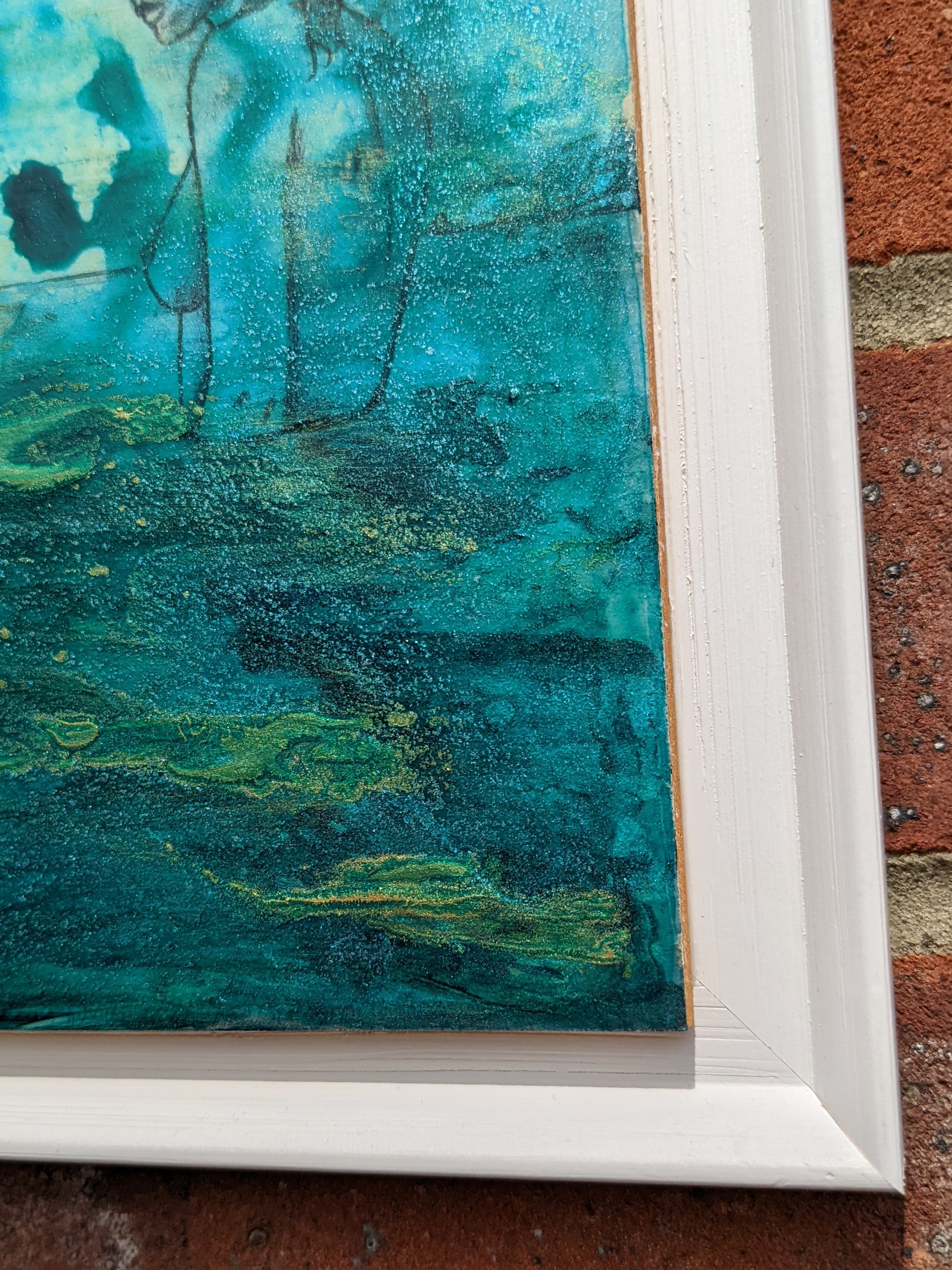 This painting is 14.5cm x 21cm painted on wood panel, the surface is smooth, I have worked here are many, many layers of paint and ink and varnish it also includes old leaf, the texture is tactile, with crackle effects and smooth finishes, you want to run your hands and your eyes over it! Watch the pearly inks glisten, reminding you of moonlight, this is a wistful and thought provoking painting.